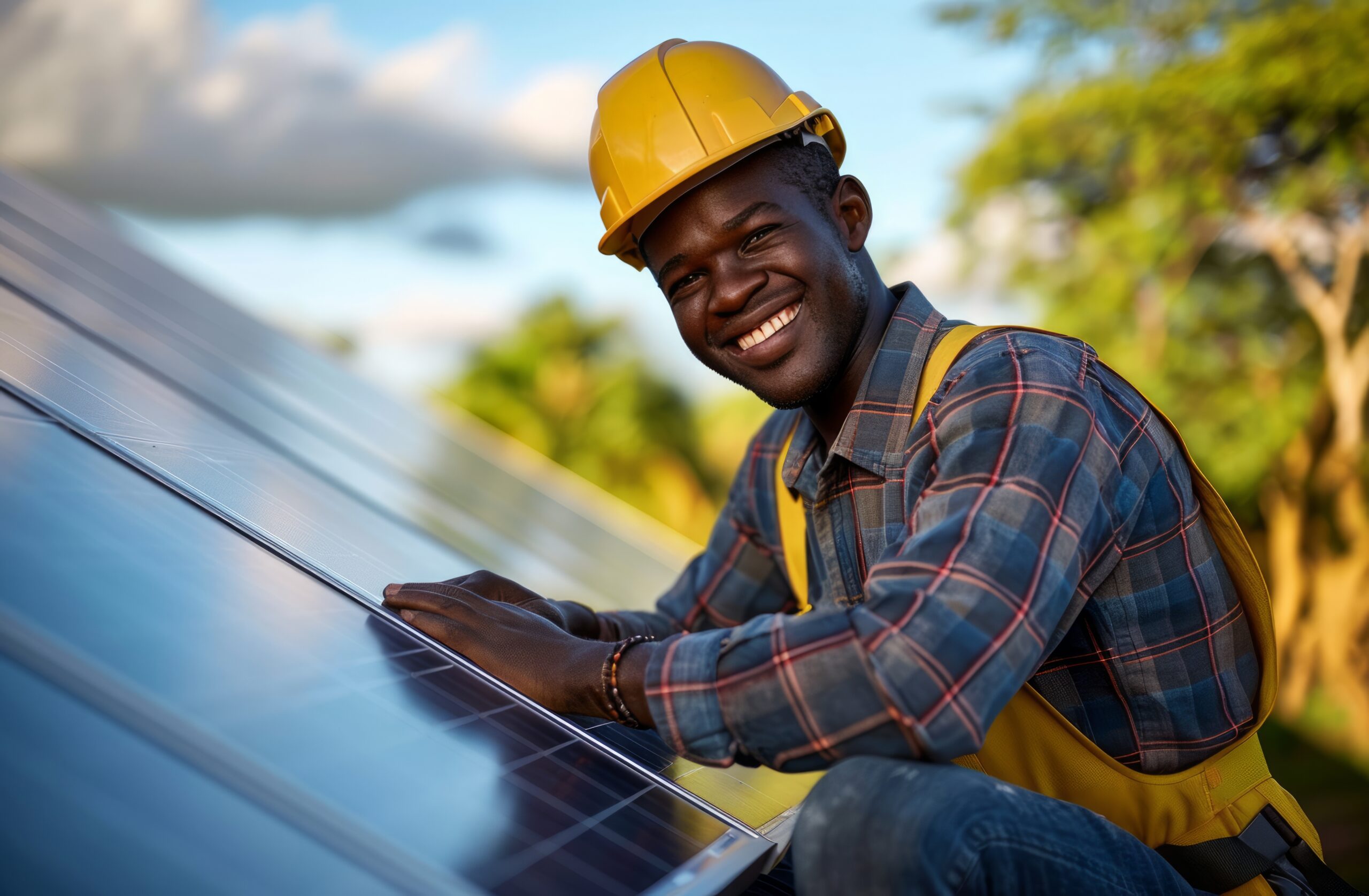 a solar technician is smiling as he installs a solar panel on the roof of his building.