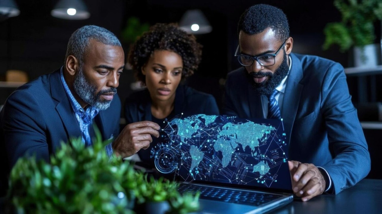 Three professionals analyze a digital world map on a laptop, emphasizing collaboration in data exploration within a modern workspace.